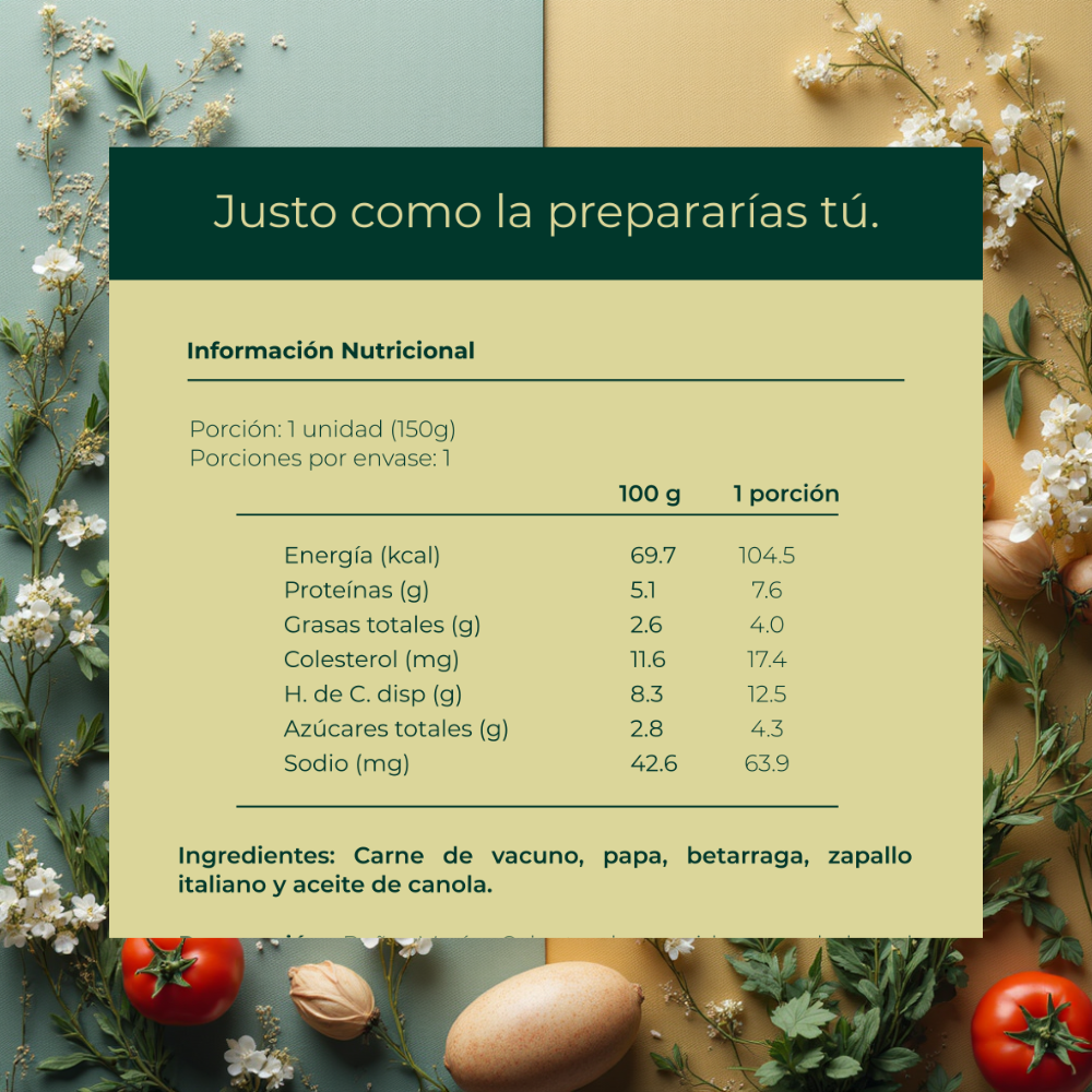 Carne de vacuno, papa, betarraga, zapallo italiano y aceite de canola.