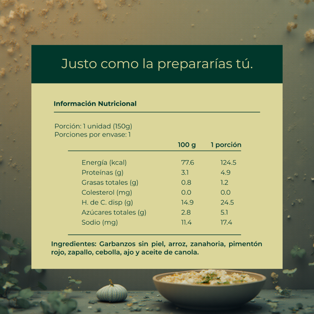 Cada porción contiene garbanzos sin piel, arroz, zanahoria, pimentón rojo, zapallo, cebolla, ajo, orégano, comino y aceite de canola. Nada más.