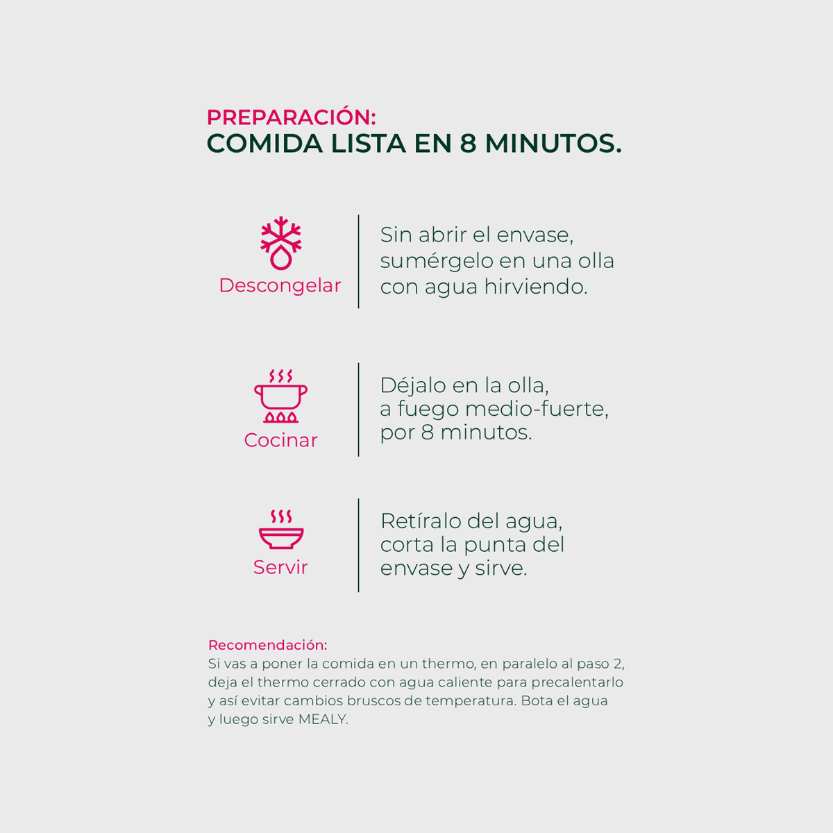 Se puede calentar en agua caliente o microondas. Estará listo en 8 minutos.